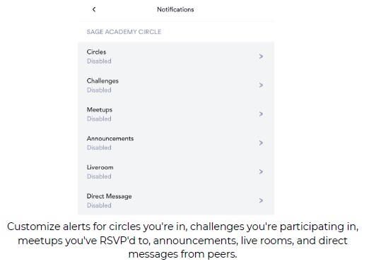 On the Notification Settings page,you can toggle 'push notifications' and 'email notification' for each feature in the Sage Academy Circle.